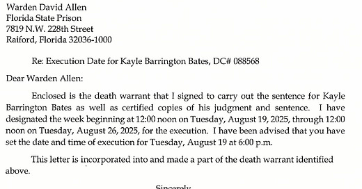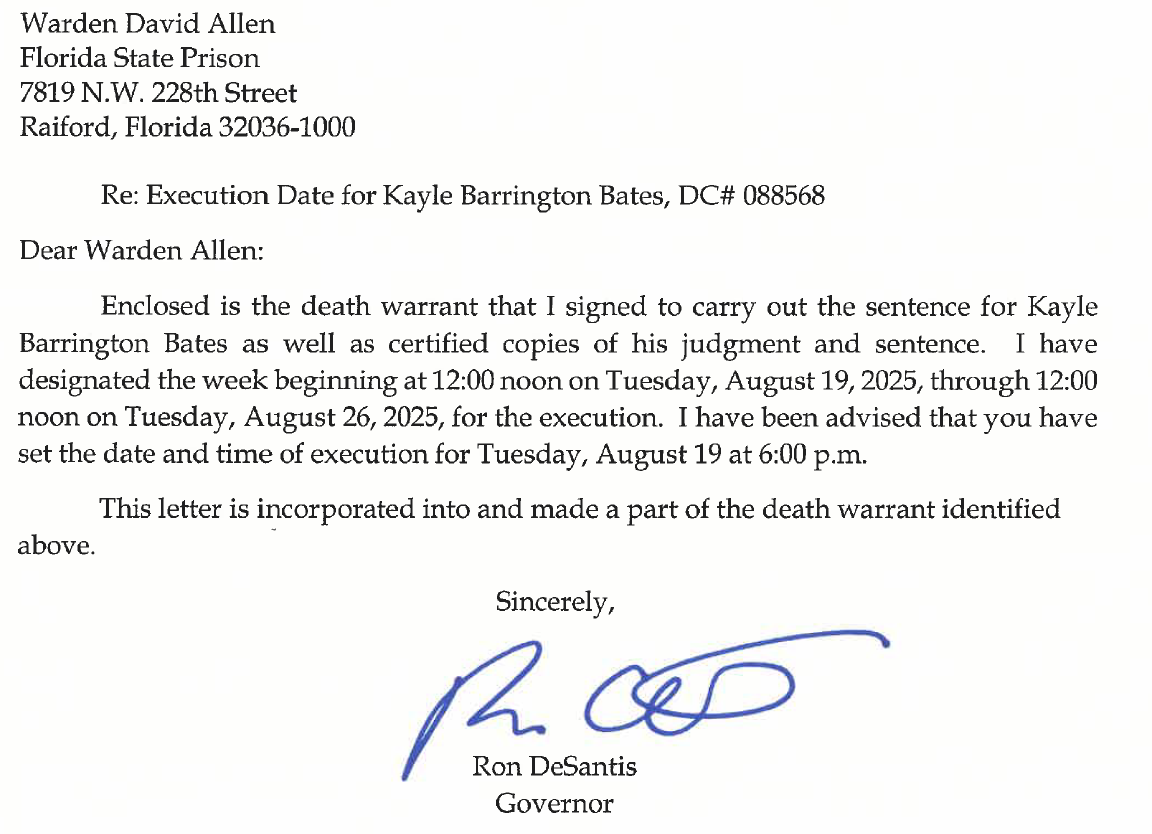 Friday afternoon, Gov. DeSantis signed a death warrant scheduling Kayle Bates’ execution for August 19 at 6:00 p.m. This is the 10th death warrant in the State this year.